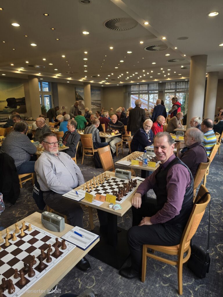 Als ich so ca. 13:00h (nach3h Spielzeit) mal bei Torsten guckte, hatten die beiden bereits die Damen vom Brett genommen und Torsten hatte einen Bauern weniger (dafür mehr Bedenkzeit). Die partie war eine sehr taktisch geprägte und komplizierte Partie, die beide Seiten aber sehr gut behandelt haben. Aber am Ende war es ein Bauer, der dann letztendlich auch die Partie beendet, indem er sich zu einer Dame umwandelte – nach einer Spielzeit von 5 Stunden und 13 Minuten wurde der Wellengang für Torsten zu hoch und er ergab sich erhobenen Hauptes. Sein Gegner verließ das Brett mit einem „Das war ja mal knapp“.